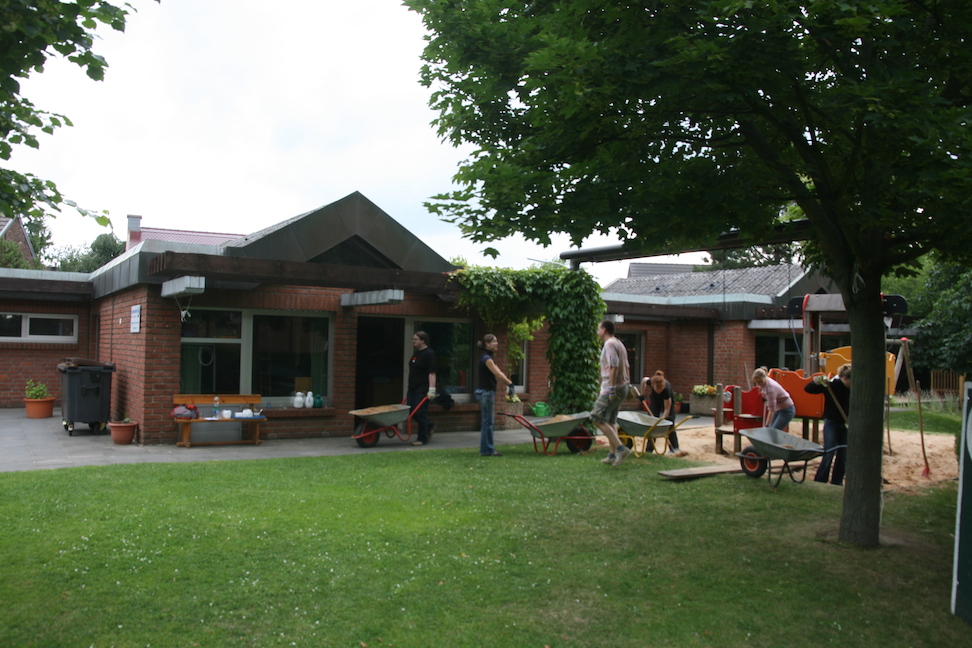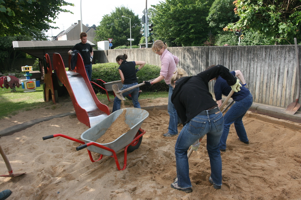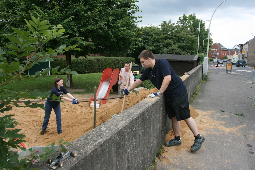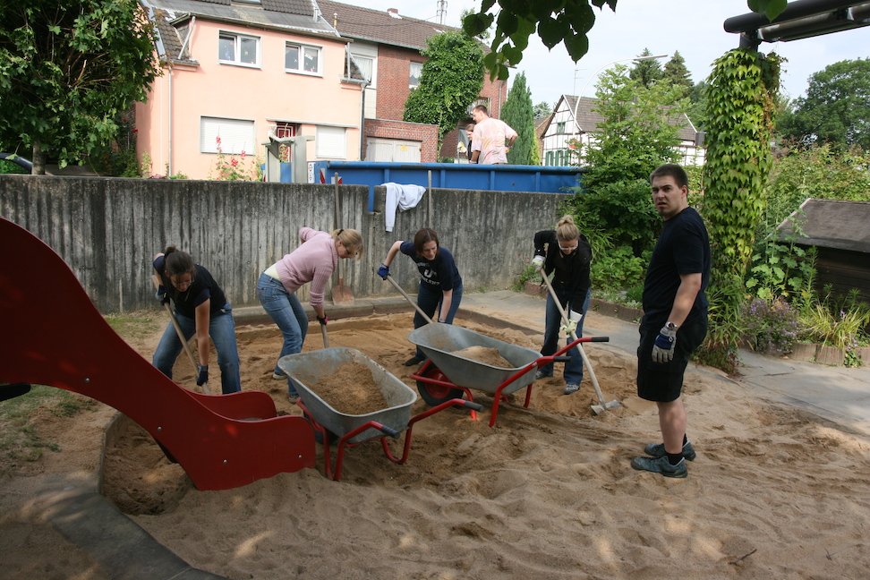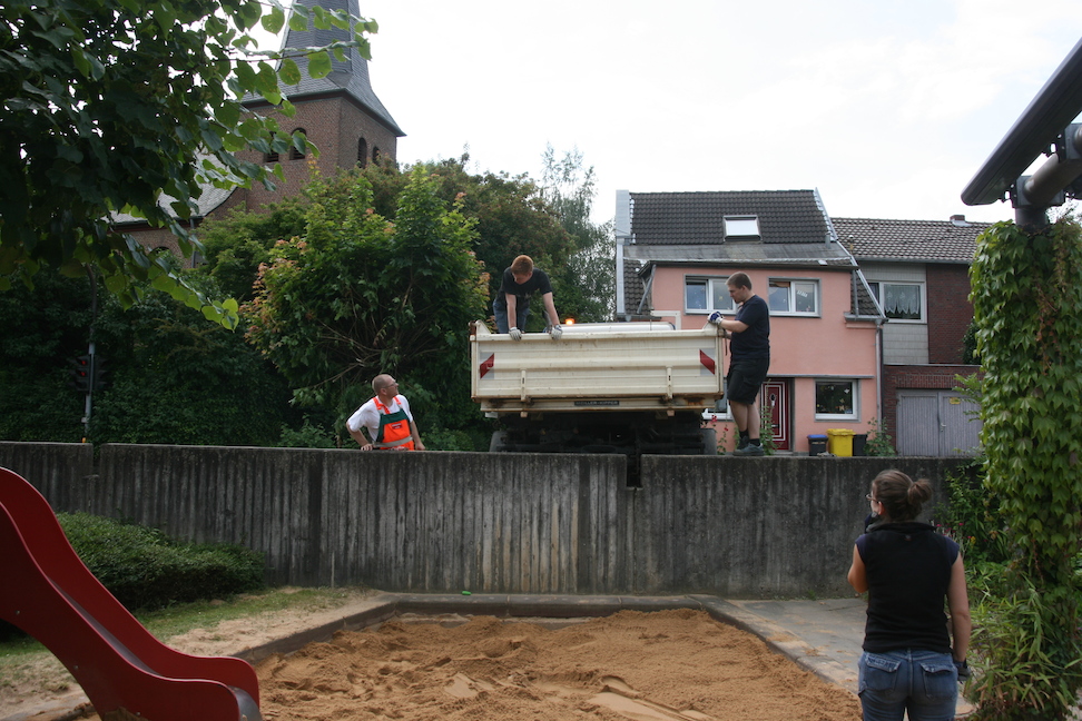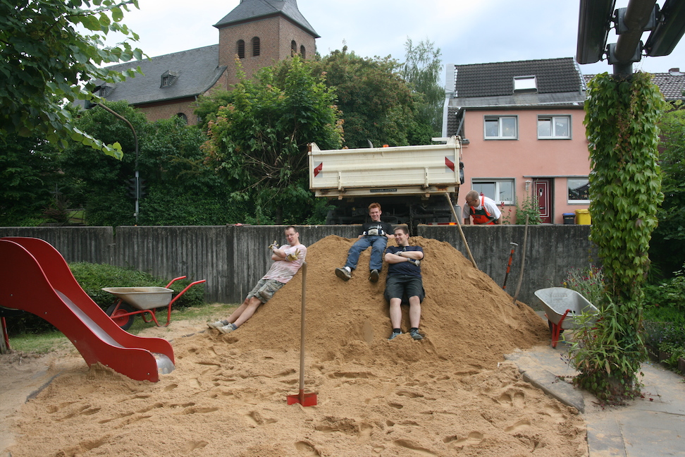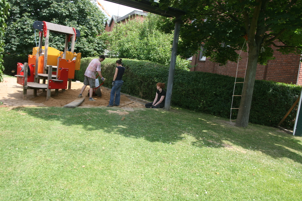 Sand mit einem Gewicht von etwa 45 Kleinwagen haben acht fleißige HELFER am Samstag, dem 20.6.2009, gemeinsam bewegt, damit die 24 Kinder der Heilpädagogischen Kindertagesstätte Käthe Kremer wieder in einem schönen und vor allem sauberen Sandkasten spielen können.