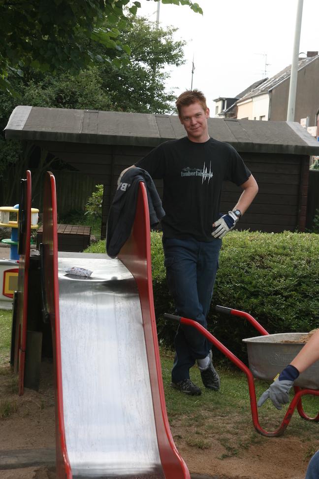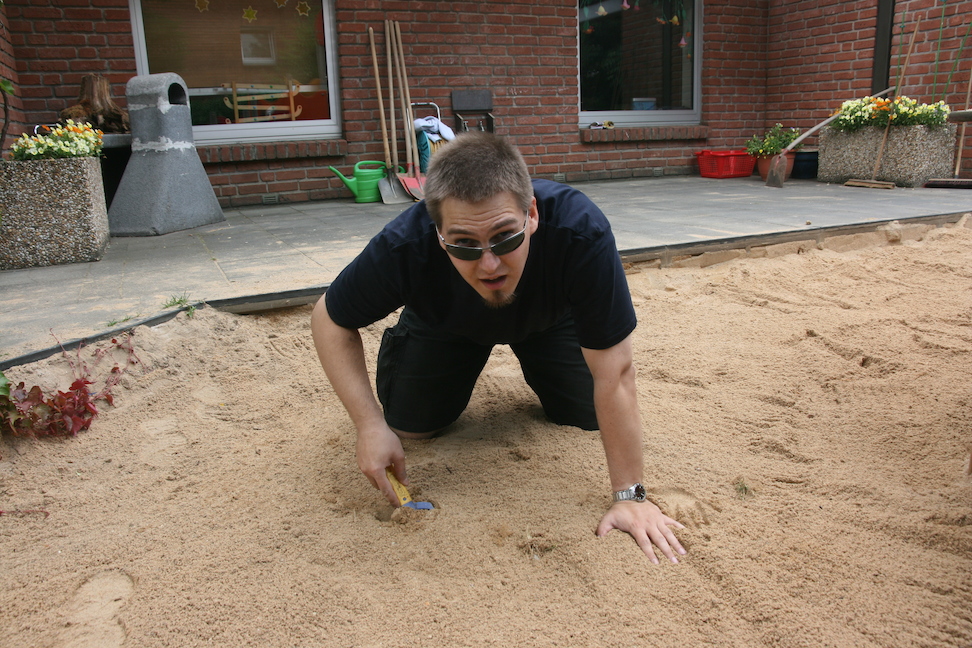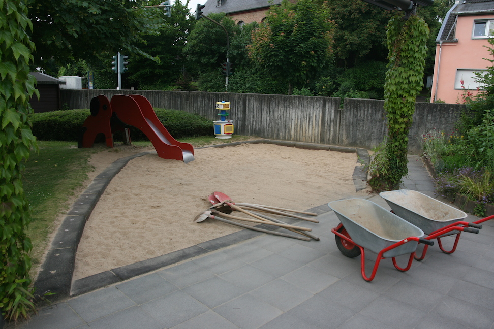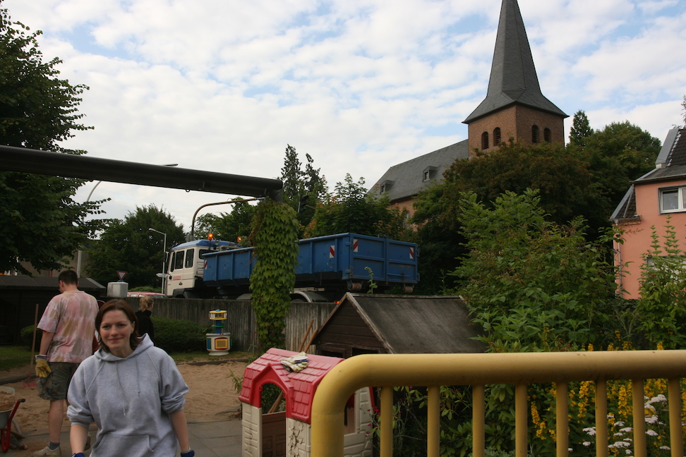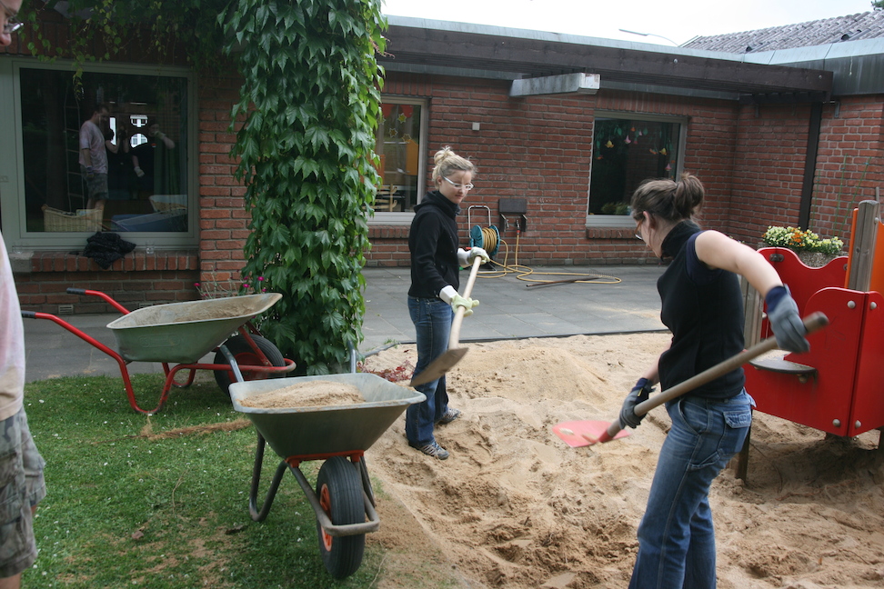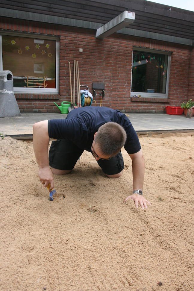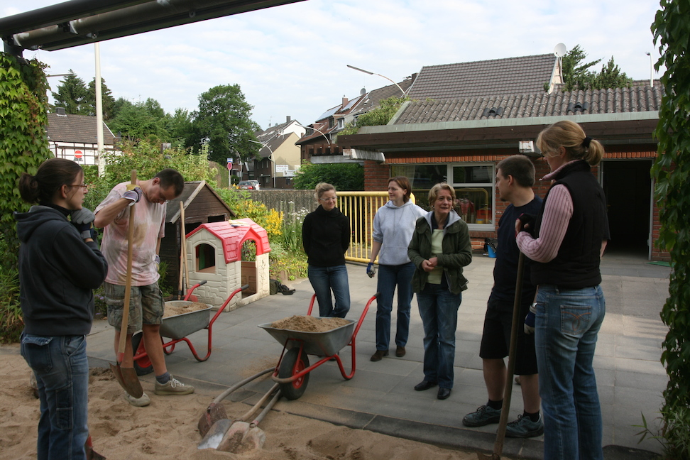 Sand mit einem Gewicht von etwa 45 Kleinwagen haben acht fleißige HELFER am Samstag, dem 20.6.2009, gemeinsam bewegt, damit die 24 Kinder der Heilpädagogischen Kindertagesstätte Käthe Kremer wieder in einem schönen und vor allem sauberen Sandkasten spielen können.