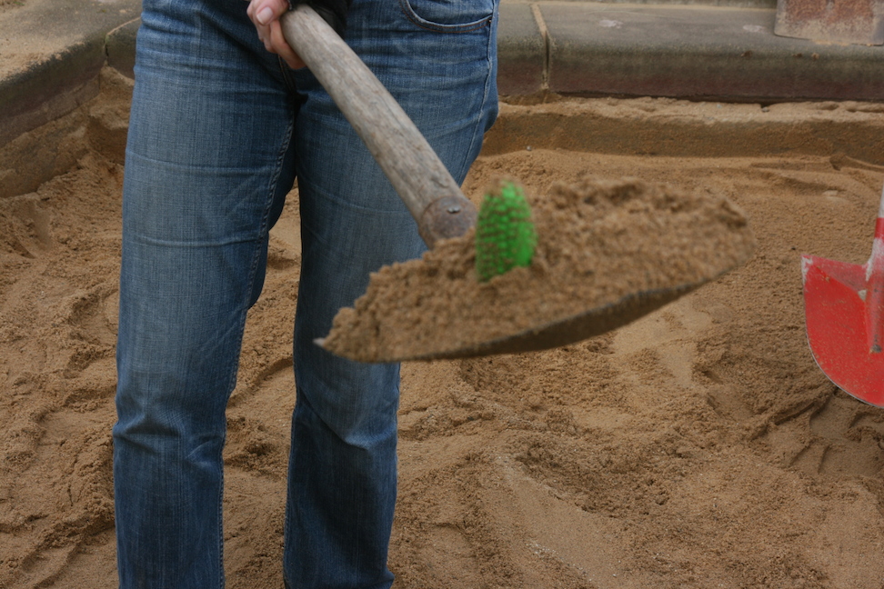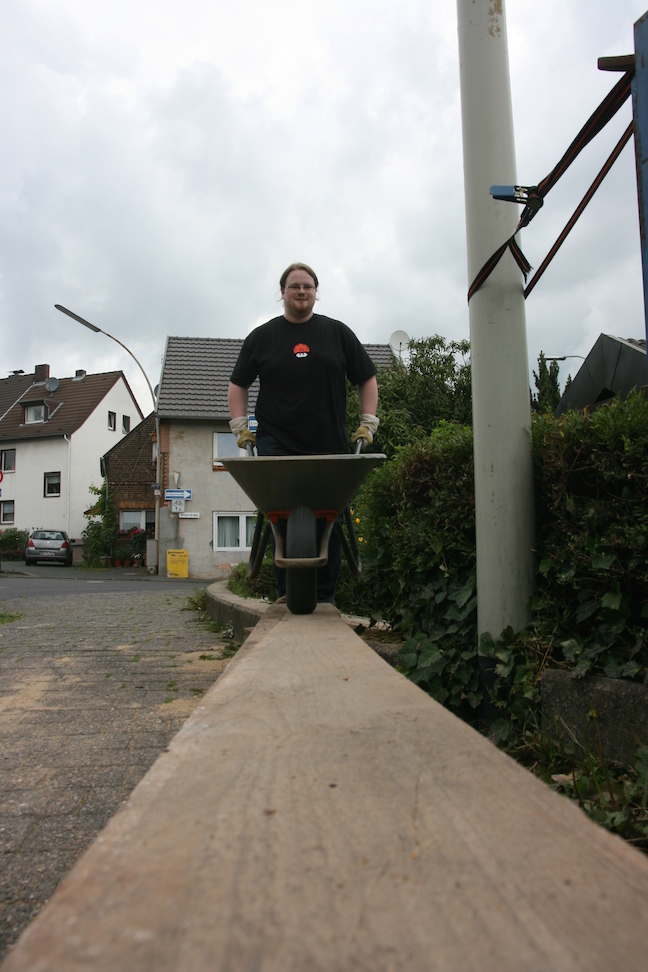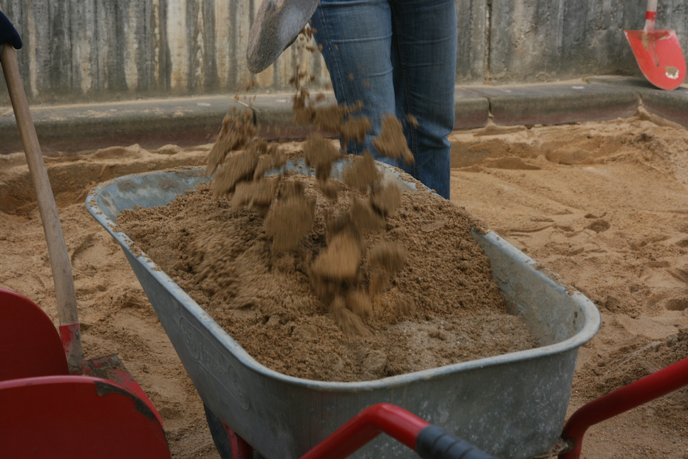 22 Tonnen später war der Sandkasten leer und wir noch lange nicht am Ende. Jetzt hieß es, 28 Tonnen frischen Sand wieder in den Sandkasten zu bugsieren. Aber, Übung macht den Meister. Zusammen haben wir auch das hinbekommen. Die ca. 15 Meter von der Straße bis zum Sandkasten überbrückten wir auf altbekanntem Weg – mit Schubkarre und Schaufel. Zwischendurch noch ein Stückchen Kuchen und um viertel nach fünf war die letzte Fuhre getan.